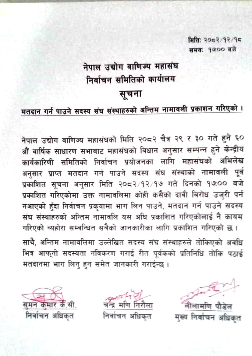 २०८२ चैत्र १८ गते मतदान गर्न पाउने सदस्य संघ संस्थाहरुको अन्तिम नामावली प्रकाशन गरिएको सूचना