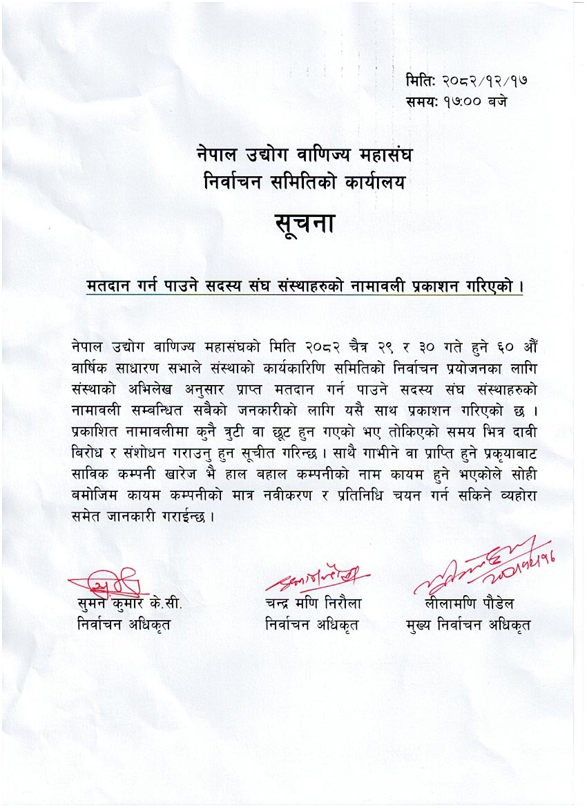 २०८२ चैत्र १७ गते मतदान गर्न पाउने सदस्य संघ संस्थाहरुको नामावली प्रकाशन गरिएको सूचना